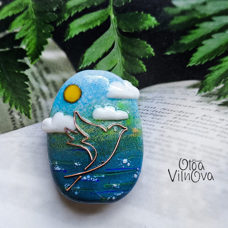 Focal lampwork bead featuring a serene seascape with sun, clouds, and a graceful bird silhouette formed in copper wire. Accented with a sparkling cubic zirconia eye, this bead captures the spirit of freedom and flight.