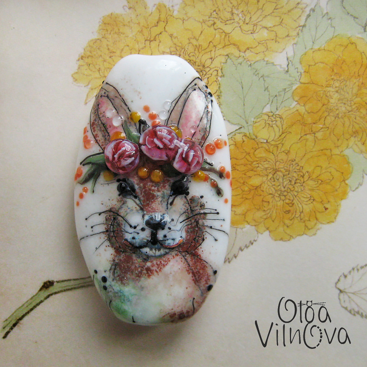 Bunny with flowers focal lampwork bead. Everything is painted with glass in the flame.