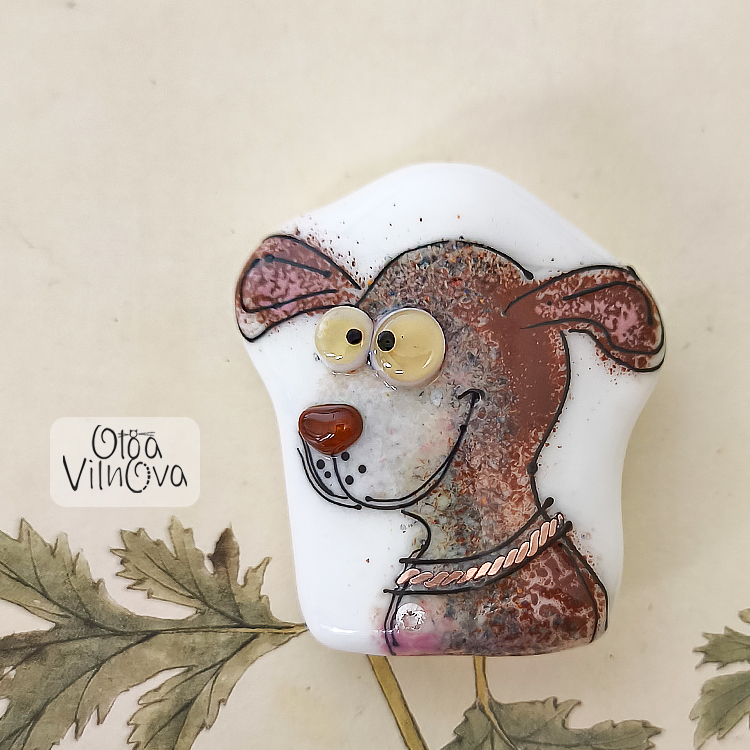 Playful dog lampwork bead, hand-drawn with glass in the flame of a torch. His copper wire collar sparkles with cubic zirconia. Each detail, from bright eyes to smiling muzzle, is shaped in the fire, making this bead a one-of-a-kind piece full of charm and character.