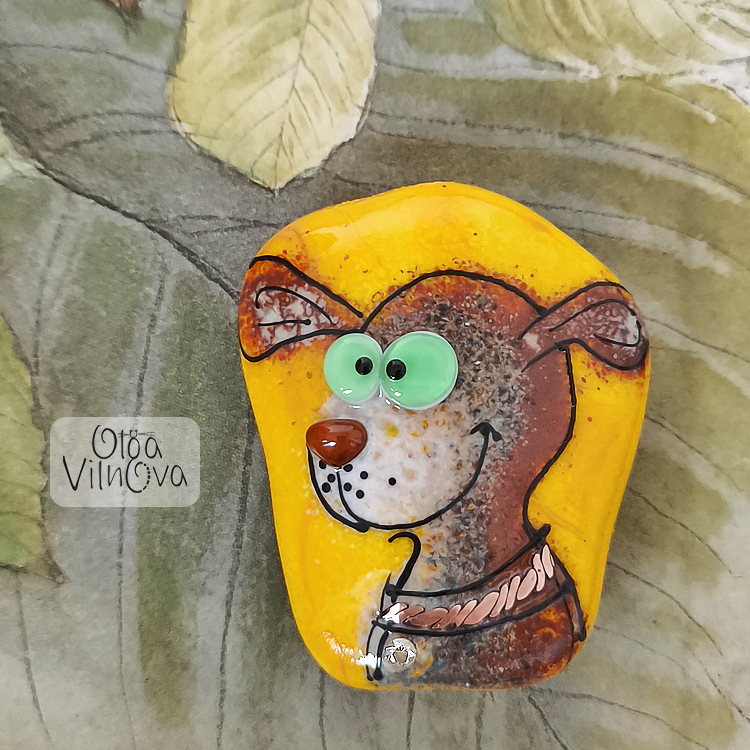 Playful dog lampwork bead, hand-drawn with glass in the flame of a torch. His copper wire collar sparkles with cubic zirconia. Each detail, from bright eyes to smiling muzzle, is shaped in the fire, making this bead a one-of-a-kind piece full of charm and character.