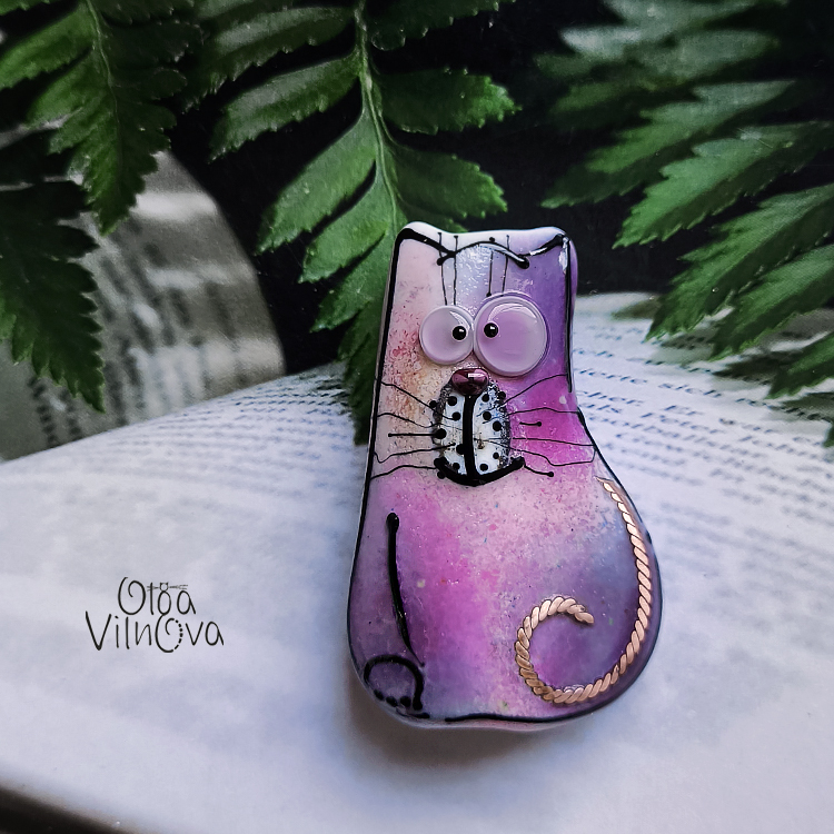 Funny cat lampwork bead, series "Afterthought". Copper wire is fused into the glass surface, polished after annealing.