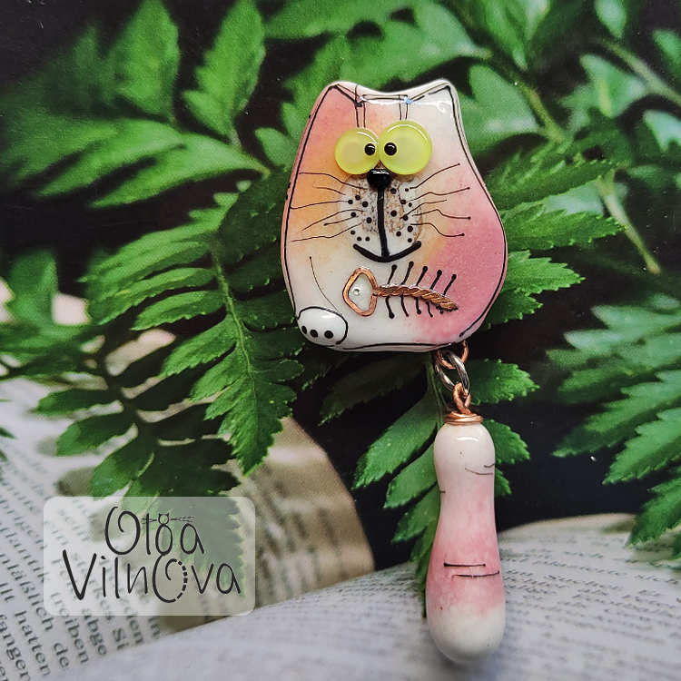 "Cat ate fish" focal lampwork bead, with a moving tail. Copper wire is fused into the glass surface, polished after annealing. Fish's eye is made of cubic zirconia. Cat is 30mm tall, and 66mm with a tail.