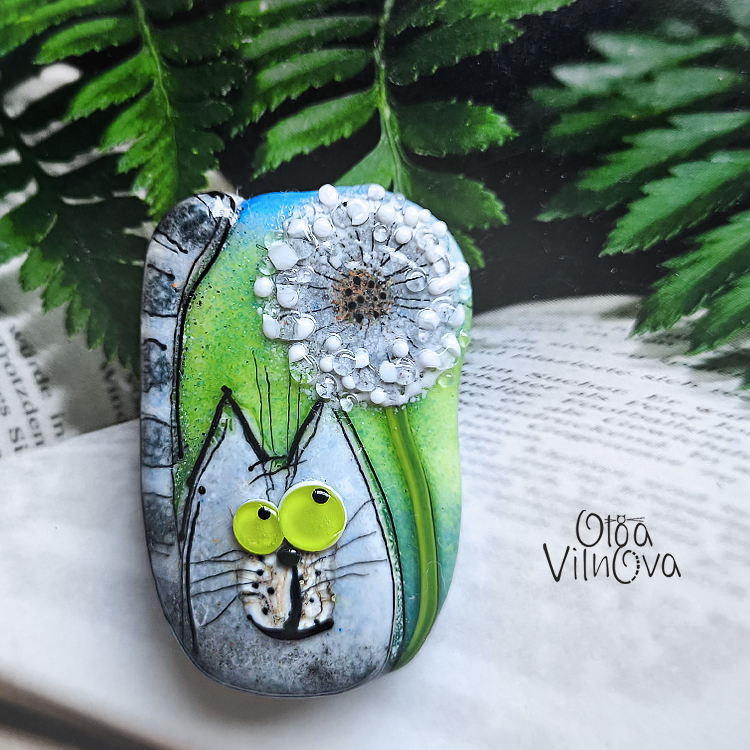 A whimsical cat and a delicate dandelion bloom come to life in this focal bead, crafted and painted entirely with glass in the flame. One-of-a-kind piece from the signature series.