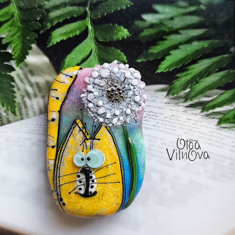 A whimsical cat and a delicate dandelion bloom come to life in this focal bead, crafted and painted entirely with glass in the flame. One-of-a-kind piece from the signature series.