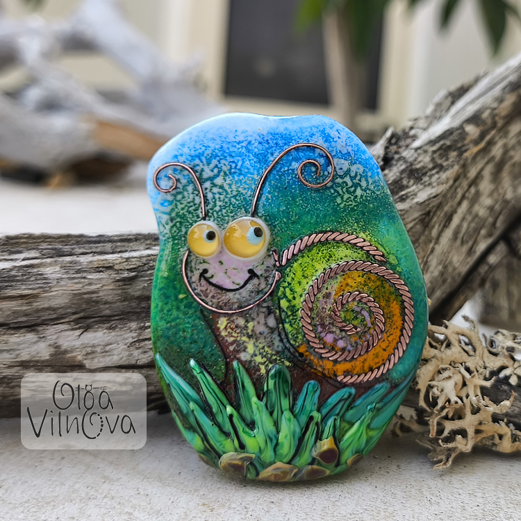 A whimsical lampwork bead features a cheerful snail with a bright, playful expression. Its spiral shell is beautifully detailed with a copper wire twist design, adding texture. At the bottom, lush green glass “leaves” create a grassy base. A delightful, one-of-a-kind piece of wearable glass art that combines intricate craftsmanship with a touch of humor and warmth.