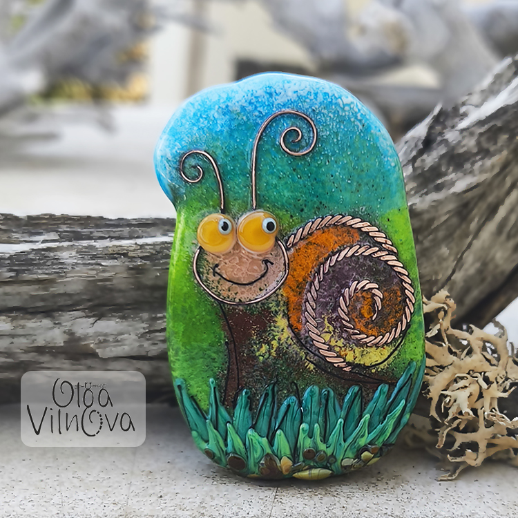 A whimsical lampwork bead features a cheerful snail with a bright, playful expression. Its spiral shell is beautifully detailed with a copper wire twist design, adding texture. At the bottom, lush green glass “leaves” create a grassy base. A delightful, one-of-a-kind piece of wearable glass art that combines intricate craftsmanship with a touch of humor and warmth.