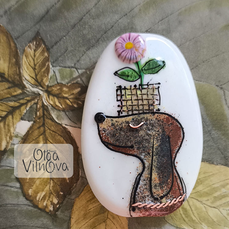 Dachshund with a flower pot faocal lampwork bead, made on a white base, with a joyful red flower in a tiny basket woven from copper mesh. Her collar is crafted with my signature copper-wire technique.