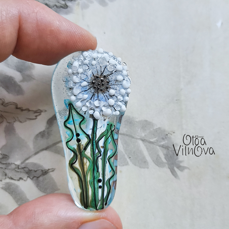 Focal lampwork bead from the "Dandelions" series. A delicate dandelion captured in glass, crafted entirely in the flame. Each petal, seed, and leaf is painted with glass, creating a unique wearable artwork.