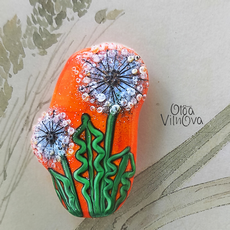Focal lampwork bead from the "Dandelions" series. Two delicate dandelions captured in glass, crafted entirely in the flame. Each petal, seed, and leaf is painted with glass, creating a unique wearable artwork.