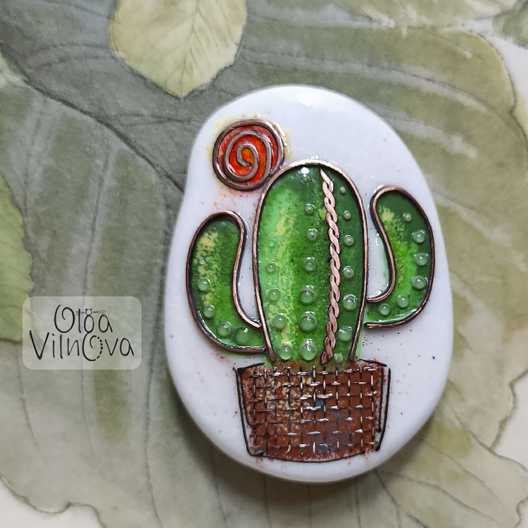 Focal lampwork glass bead featuring a blooming cactus in a copper-mesh pot. Each tiny detail is painted with glass and copper in the flame in my signature technique, creating a vivid, textured miniature desert story - unique and full of life.