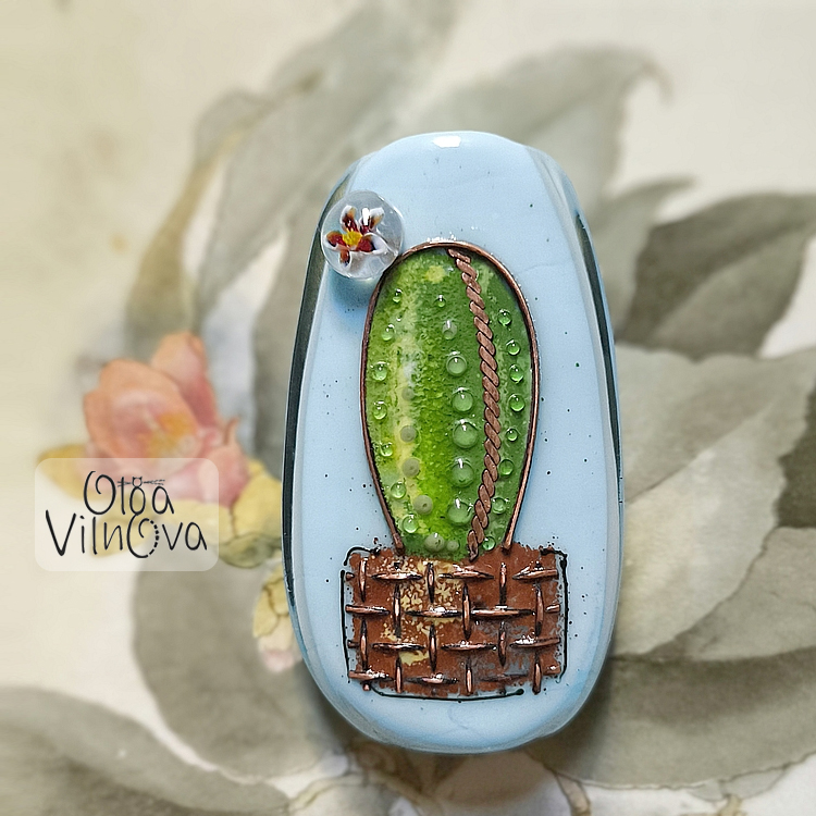 Focal lampwork glass bead featuring a blooming cactus in a copper-mesh pot. Each tiny detail is painted with glass and copper in the flame in my signature technique, creating a vivid, textured miniature desert story - unique and full of life.