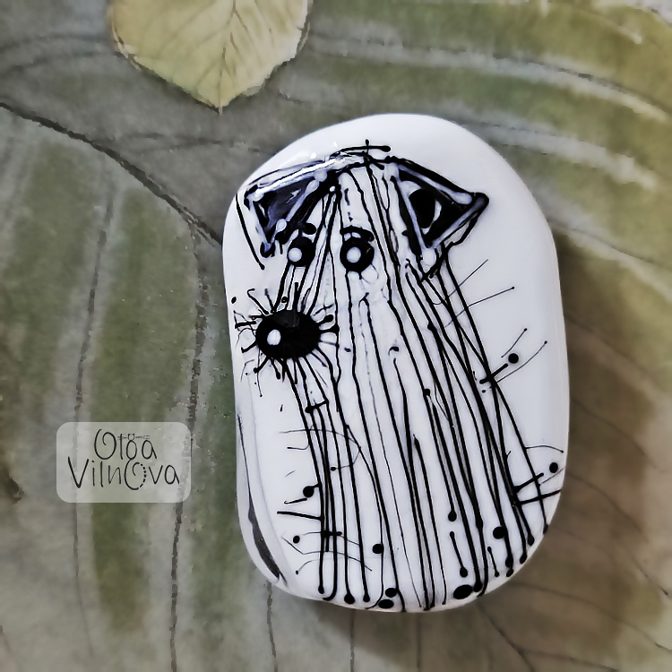 This focal bead has white background with fine black stringer strokes that read like a quick ink sketch - ears, wide startled eyes, a gloriously oversized nose, and whiskers that stick out like they have their own opinion about everything.