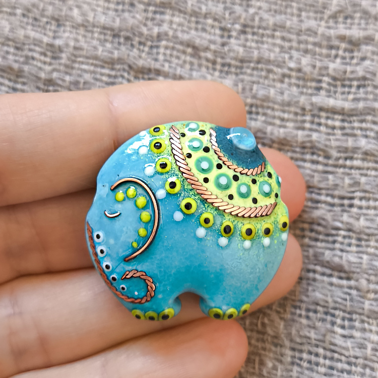 Elephant focal lampwork bead. Decorated with fused copper wire and vibrant details. Balanced design prevents flipping. Wire is polished after annealing for a smooth finish. Unique wearable glass art.