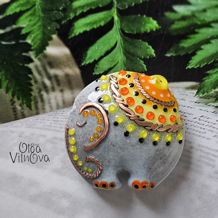 Elephant focal lampwork bead. Decorated with fused copper wire and vibrant details. Balanced design prevents flipping. Wire is polished after annealing for a smooth finish. Unique wearable glass art.