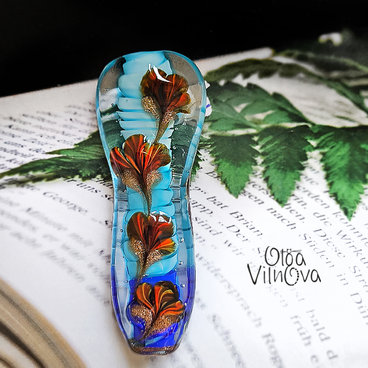 Focal lampwork glass bead “Garden in Glass” - floral bead with ribbed core, created in flame with custom floral canes. Shades of blue and orange-red with a hint of gold sparkle bring a touch of blooming spring to your jewelry design.