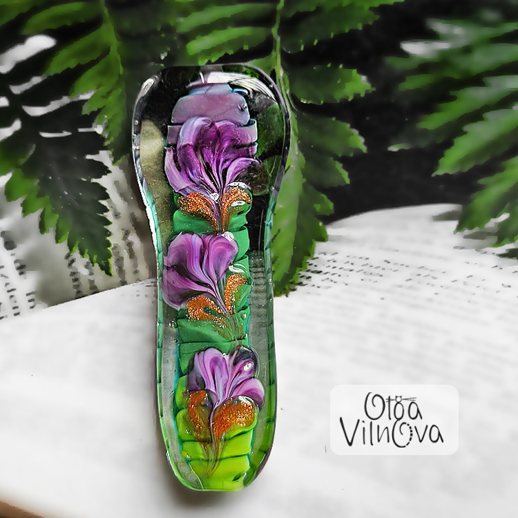 Focal lampwork glass bead “Garden in Glass” - floral bead with ribbed core, created in flame with custom floral canes. Shades of green and violet with a hint of gold sparkle bring a touch of blooming spring to your jewelry design.