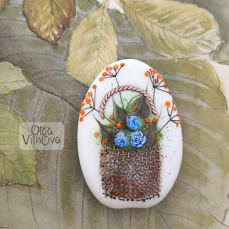 A delicate flower basket design with copper mesh texture and a copper wire handle in my signature technique. Each bloom is unique. Perfect for a garden-inspired pendant or keepsake piece.