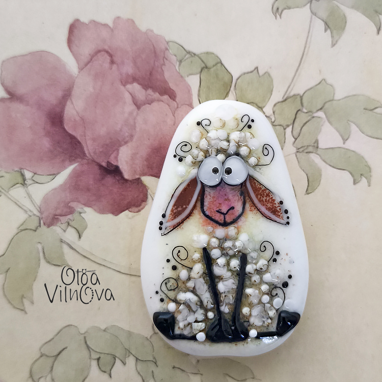 One-of-a-kind focal bead from the 'Goofy Sheep' series. Sculpted and painted with glass in the flame. This cheerful sheep, with her wild curly wool and big curious eyes, is sure to make you smile.