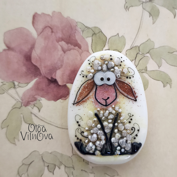 One-of-a-kind focal bead from the 'Goofy Sheep' series. Sculpted and painted with glass in the flame. This cheerful sheep, with her wild curly wool and big curious eyes, is sure to make you smile..