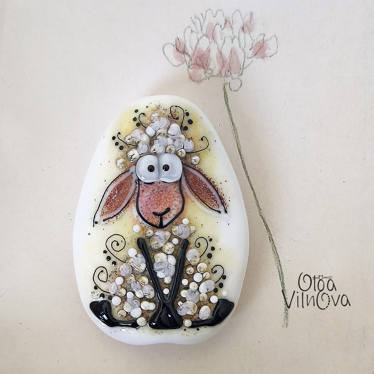 One-of-a-kind focal bead from the 'Goofy Sheep' series. Sculpted and painted with glass in the flame. This cheerful sheep, with her wild curly wool and big curious eyes, is sure to make you smile.