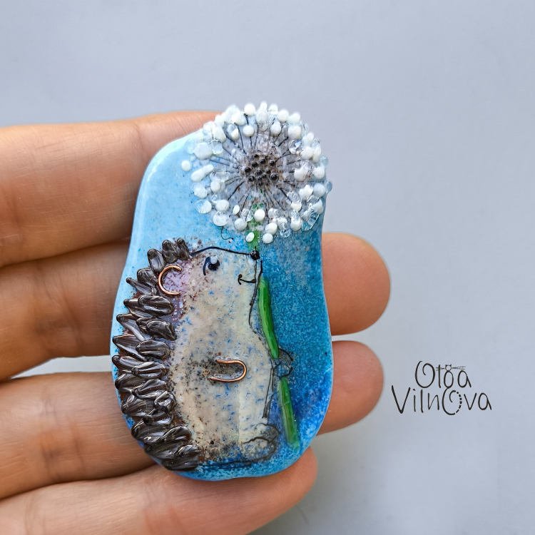 Focal bead from the "Hedgehogs with the flowers" series. Everything is painted with glass in the flame. Copper wire is fused into the glass surface, polished after annealing.