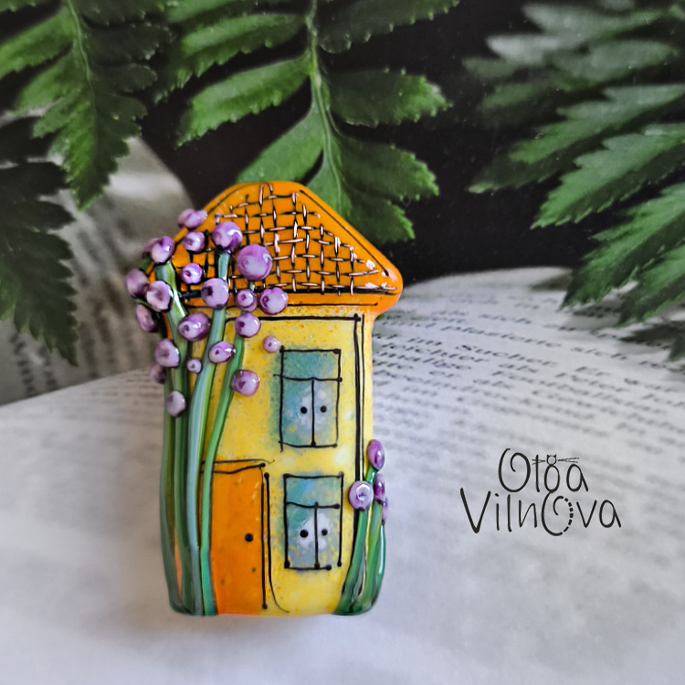 This lampwork bead is more than jewelry – it’s a tiny fairytale you can wear. Handmade from glass in the shape of a bright little house, it features a green roof with a delicate copper mesh, tiny blue windows, and a blooming lilac tree made of glass drops climbing up the wall.
