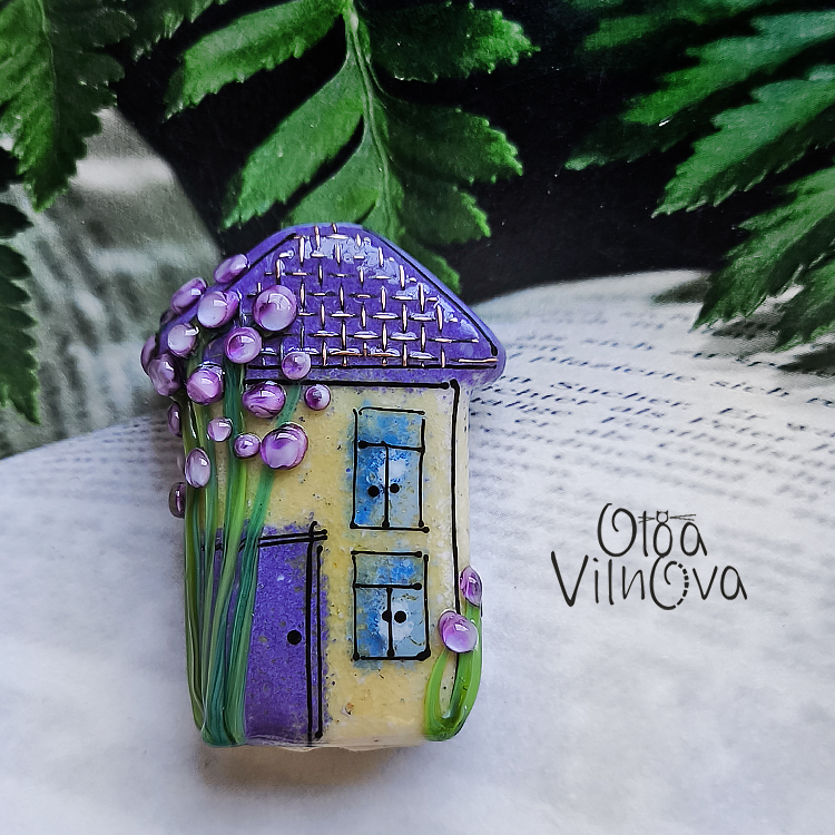 This lampwork bead is more than jewelry – it’s a tiny fairytale you can wear. Handmade from glass in the shape of a bright little house, it features a purple roof with a delicate copper mesh, tiny blue windows, and a blooming lilac tree made of glass drops climbing up the wall.