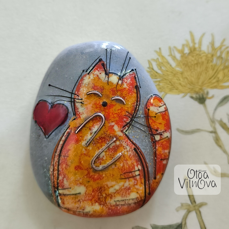 This little fellow is part of my “Hopelessly in Love” kitty series. Lampwork glass bead, made in the flame, where every line is drawn with glass and tiny copper lines made in my signature technique give her additional charm.