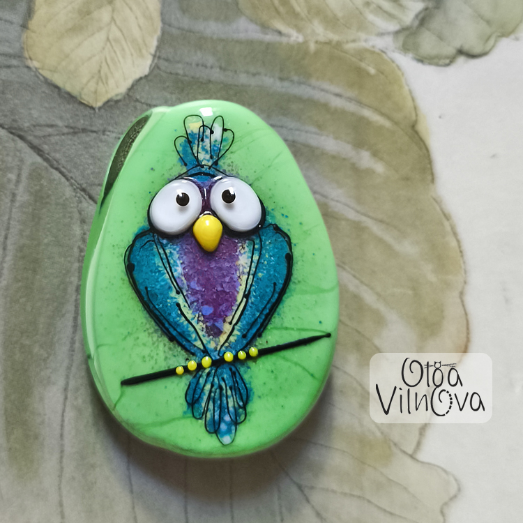 Parrot out of context - a little glass personality - unapologetically colorful, slightly suspicious, with bewildered eyes that seem to be taking in far more than expected.