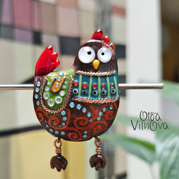 A whimsical lampwork glass chicken bead with a bold patchwork personality. Handmade in the flame, with rich colors, playful surface details, and signature copper wire accents. The dangling legs add gentle movement and charm.