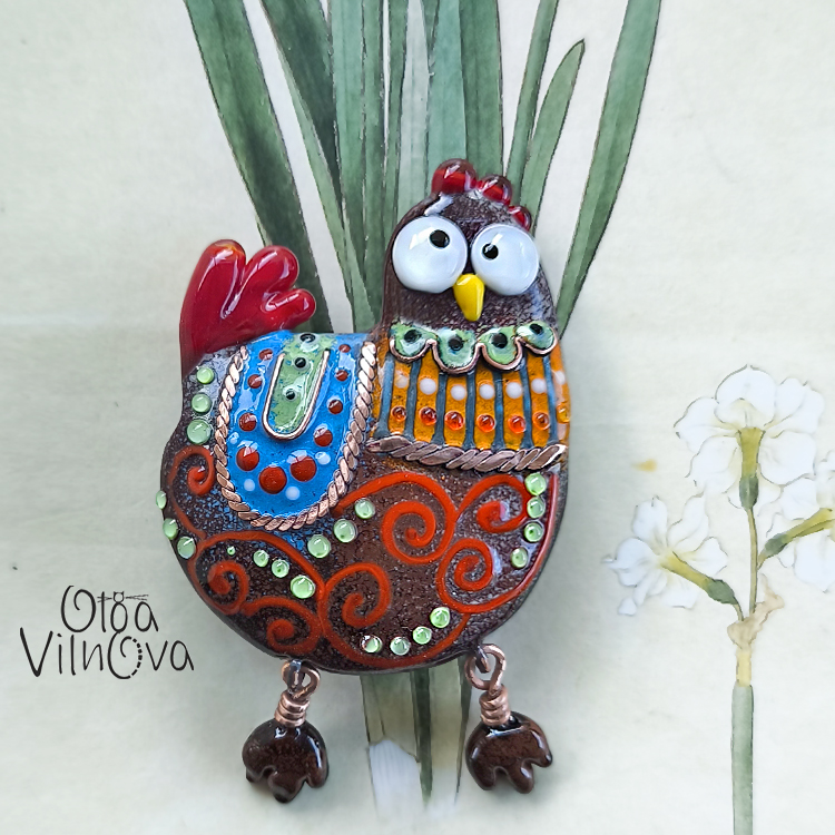 A whimsical lampwork glass chicken bead with a bold patchwork personality. Handmade in the flame, with rich colors, playful surface details, and signature copper wire accents. The dangling legs add gentle movement and charm.
