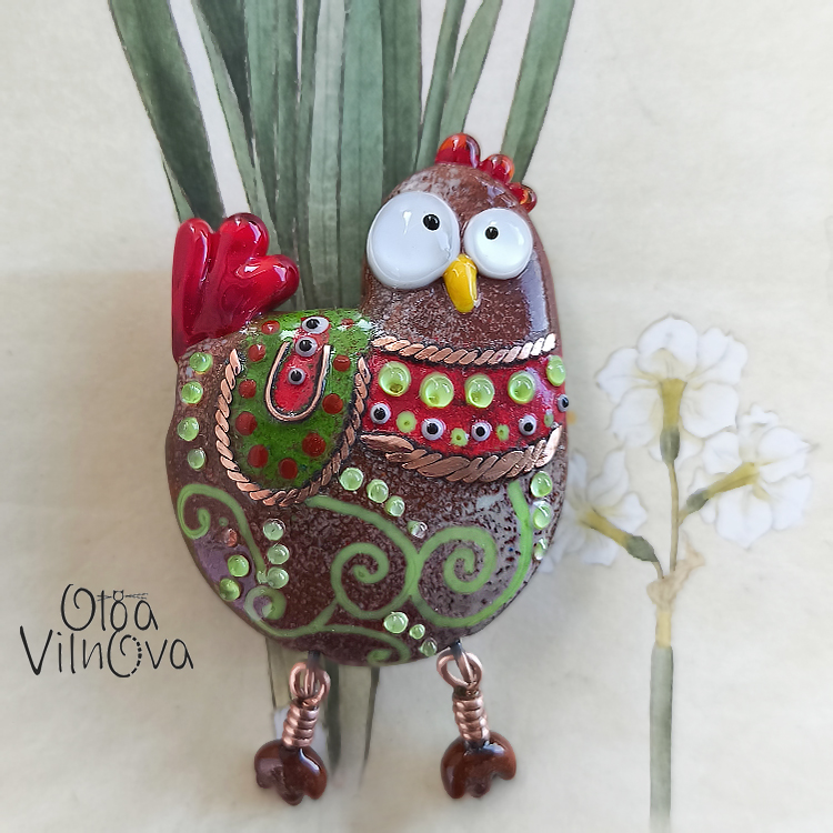 A whimsical lampwork glass chicken bead with a bold patchwork personality. Handmade in the flame, with rich colors, playful surface details, and signature copper wire accents. The dangling legs add gentle movement and charm.