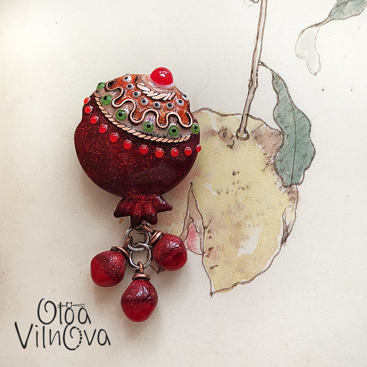 Pomegranate focal lampwork bead with moving seeds. Copper wire is fused into the glass surface, polished after annealing.