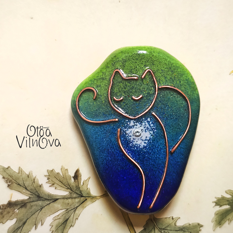 Lampwork glass bead with an elegant cat silhouette, sculpted in the flame + my signature copper wire technique. A small cubuc zirconia sparkles on the white chest, adding quiet charm and timeless character.