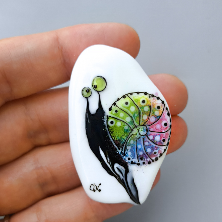 A bold black snail with wide, curious eyes and a vibrant rainbow shell from the "Rainbow on Black: Whimsical Creatures" series. This focal bead blends deep midnight glass with joyful bursts of color, creating a playful contrast that feels both dramatic and lighthearted.