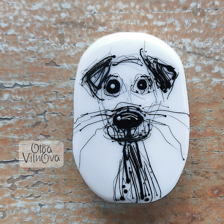 Lampwork focal bead in white glass, drawn with fine black lines directly in the flame. An expressive, sketch-like dog that feels more like a quiet witness than a character - thoughtful, alert, and full of subtle presence.