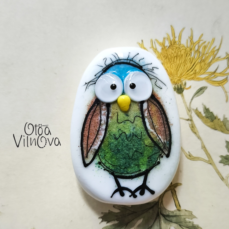 Lampwork glass bead from the Utterly Perplexed Birds series. They are not scared. Not sad. Just deeply confused by the surrounding reality. Drawn freehand in the flame, no repeats.