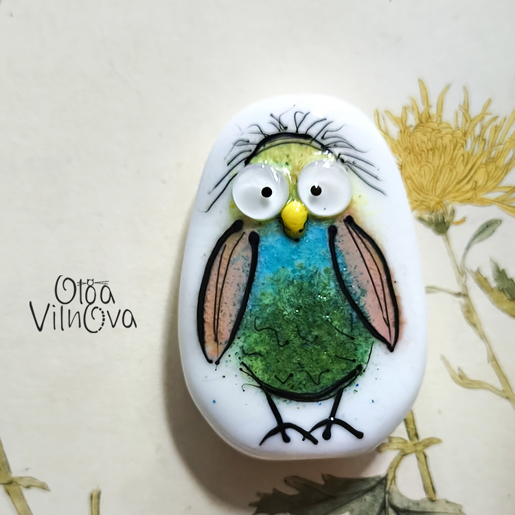 Lampwork glass bead from the Utterly Perplexed Birds series. They are not scared. Not sad. Just deeply confused by the surrounding reality. Drawn freehand in the flame, no repeats.