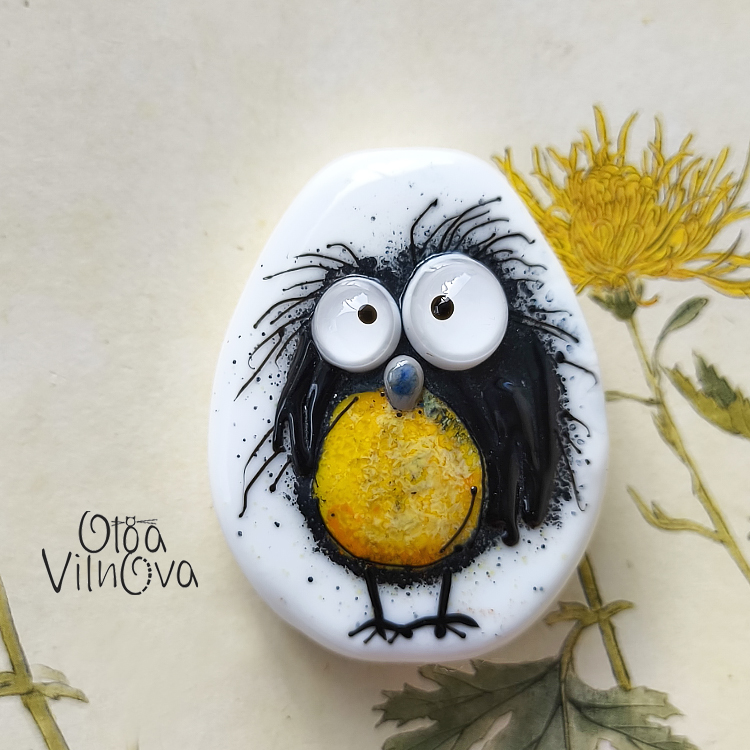 Lampwork glass bead from the World-weary Birds series. Slightly disheveled, wide-eyed, and full of attitude. Drawn freehand in the flame — no molds, no repeats. Crisp black lines, warm yellow belly, soft white background, and just enough chaos to feel alive.