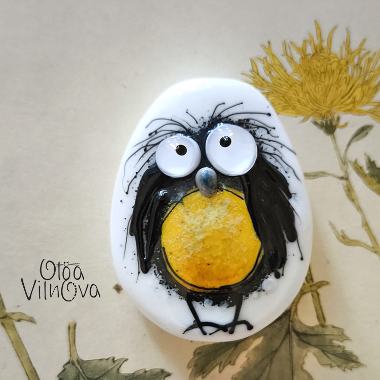Lampwork glass bead from the World-weary Birds series. Slightly disheveled, wide-eyed, and full of attitude. Drawn freehand in the flame - no molds, no repeats. Crisp black lines, warm yellow belly, soft white background, and just enough chaos to feel alive.