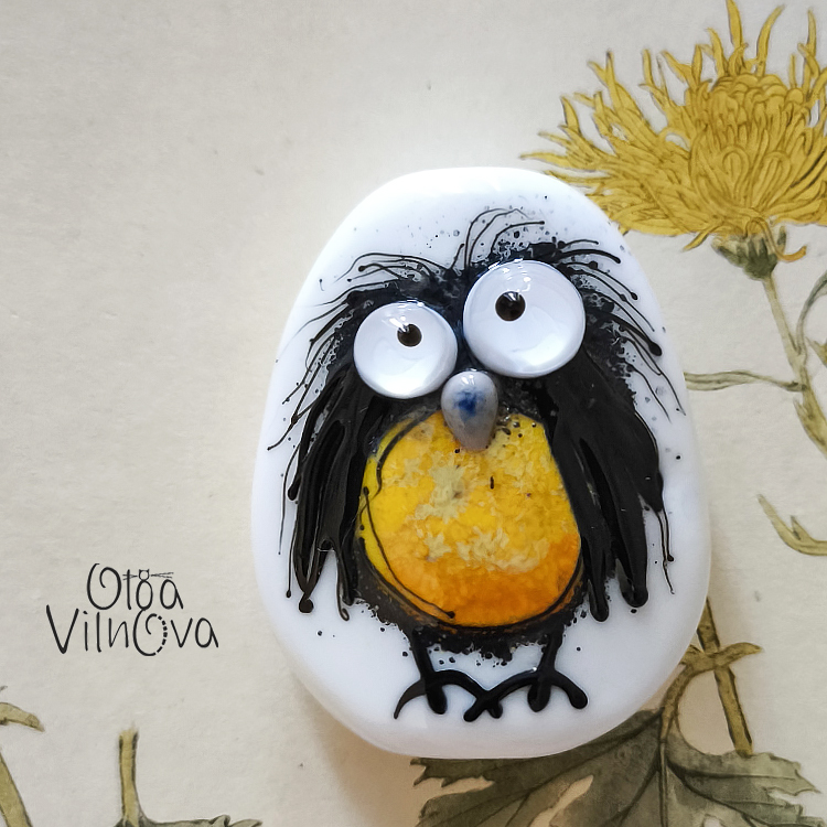 Lampwork glass bead from the World-weary Birds series. Slightly disheveled, wide-eyed, and full of attitude. Drawn freehand in the flame - no molds, no repeats. Crisp black lines, warm yellow belly, soft white background, and just enough chaos to feel alive.
