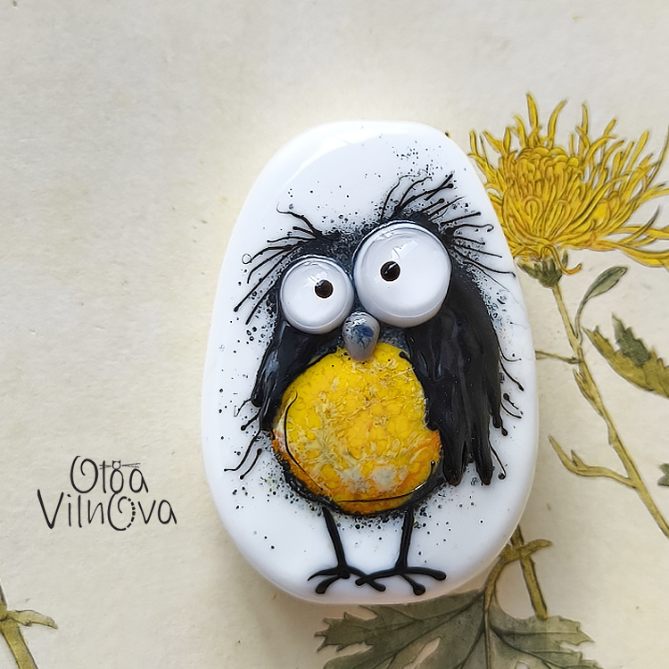 Lampwork glass bead from the World-weary Birds series. Slightly disheveled, wide-eyed, and full of attitude. Drawn freehand in the flame — no molds, no repeats. Crisp black lines, warm yellow belly, soft white background, and just enough chaos to feel alive.