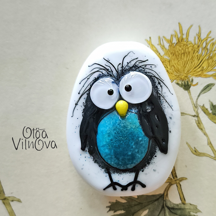 Lampwork glass bead from the World-weary Birds series. Slightly disheveled, wide-eyed, and full of attitude. Drawn freehand in the flame - no molds, no repeats. Crisp black lines, blue-teal belly, soft white background, and just enough chaos to feel alive.