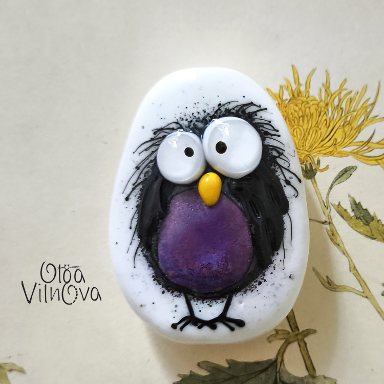 Lampwork glass bead from the World-weary Birds series. Slightly disheveled, wide-eyed, and full of attitude. Drawn freehand in the flame — no molds, no repeats. Crisp black lines, purple belly, soft white background, and just enough chaos to feel alive.