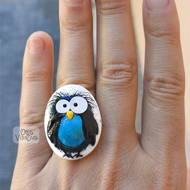 Lampwork changeable top "World-weary Bird". Slightly disheveled, wide-eyed, and full of attitude. Drawn freehand in the flame. Crisp black lines, blue-teal belly, white background, and just enough chaos to feel alive.